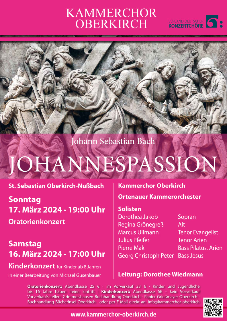 17.3.24, 19 Uhr, St. Sebastian Oberkirch - Nußbach: J. S. Bach, Johannespassion. Dorothea Jakob - Sopran; Regina Grönegreß - Alt; Christian Georg - Tenor (Evangelist); Julius Pfeifer - Tenor (Arien); Pierre Mak - Bass (Arien); Georg Christoph Peter - Bass (Christusworte). Kammerchor Oberkirch, Ortenauer Kammerorchester. Leitung: Dorothee Wiedmann