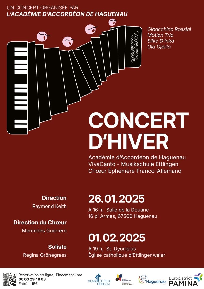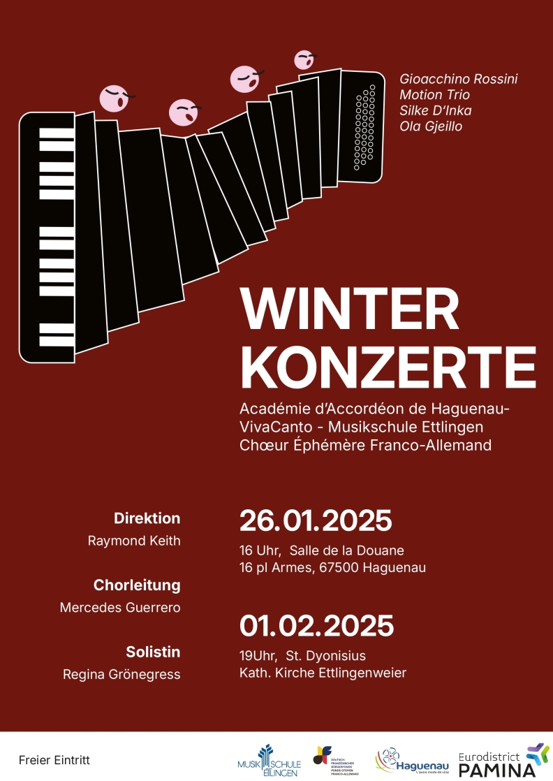 26.1.25, 16 Uhr, Salle de la Douane Haguenau (Elsaß): G. Rossini, Teile aus der "Petite Messe Solennelle" (u. a. Agnus Dei). Regina Grönegreß - Mezzosopran; Chor der Musikschule Ettlingen "Viva Canto"; Choeur Éphémère Franco-Allemand, Académie d'Accordéon de Haguenau. Leitung: Mercedes Guerrero Arciniegas und Raymond Keith