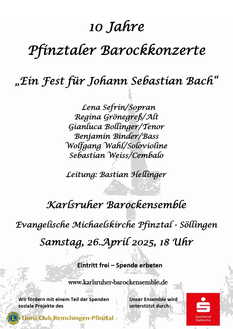 26.4.25, 18 Uhr, Michaelskirche Pfinztal-Söllingen: "Ein Fest für Johann Sebastian Bach". Arien, Chöre und Orchestermusik. Regina Grönegreß - Alt. Karlsruher Barockensemble. Leitung: Bastian Hellinger