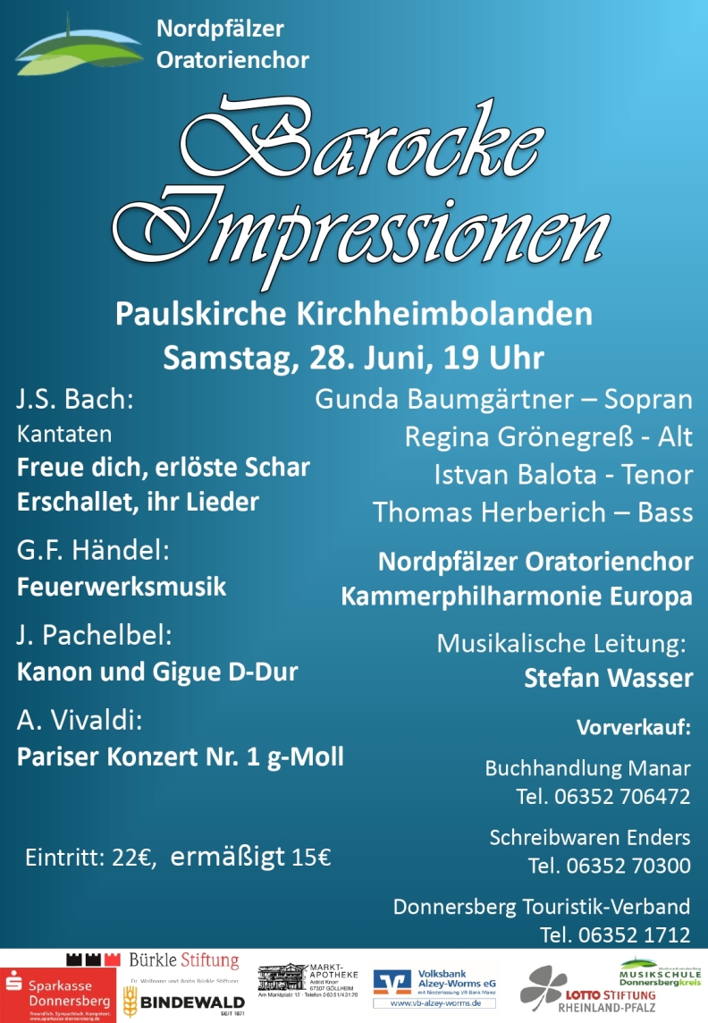 28.6.25, 19 Uhr, Paulskirche Kirchheimbolanden: J. S. Bach, Kantaten "Erschallet, ihr Lieder" / "Freue dich, erlöste Schar". Gunda Baumgärtner - Sopran; Regina Grönegreß - Alt; Istvan Balota - Tenor; Thomas Herberich - Bass. Leitung: Stefan Wasser