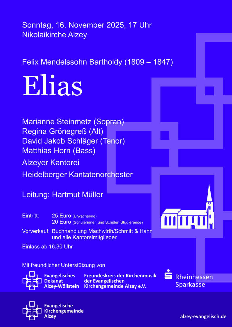 16.11.25, 17 Uhr, Nikolaikirche Alzey: F. Mendelssohn, Elias. Marianne Steinmetz - Sopran; Regina Grönegreß - Alt; David Jakob Schläger - Tenor; Matthias Horn - Bass. Alzeyer Kantorei; Heidelberger Kantatenorchester. Leitung: Hartmut Müller