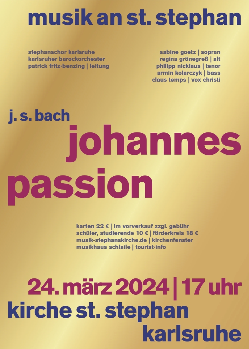 24.3.24, 17 Uhr, St. Stephan Karlsruhe: J. S. Bach, Johannespassion. Sabine Goetz - Sopran; Regina Grönegreß, Alt; Philipp Nicklaus - Tenor; Armin Kolarczyk - Bass (Arien); Claus Temps, Bass (Christusworte). Stephanschor, Karlsruher Barockorchester. Leitung: Patrick Fritz-Benzing