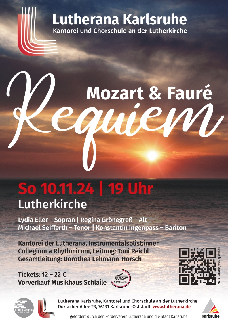 10.11.24, 19 Uhr, Lutherkirche Karlsruhe: W. A. Mozart, Requiem. Lydia Eller - Sopran; Regina Grönegreß - Alt; Michael Seifferth - Tenor; Konstantin Ingenpass - Bariton. Collegium a Rhythmicum, Leitung: Toni Reichl. Instrumentalsolisten, Kantorei der Lutherana. Leitung: Dorothea Lehmann-Horsch