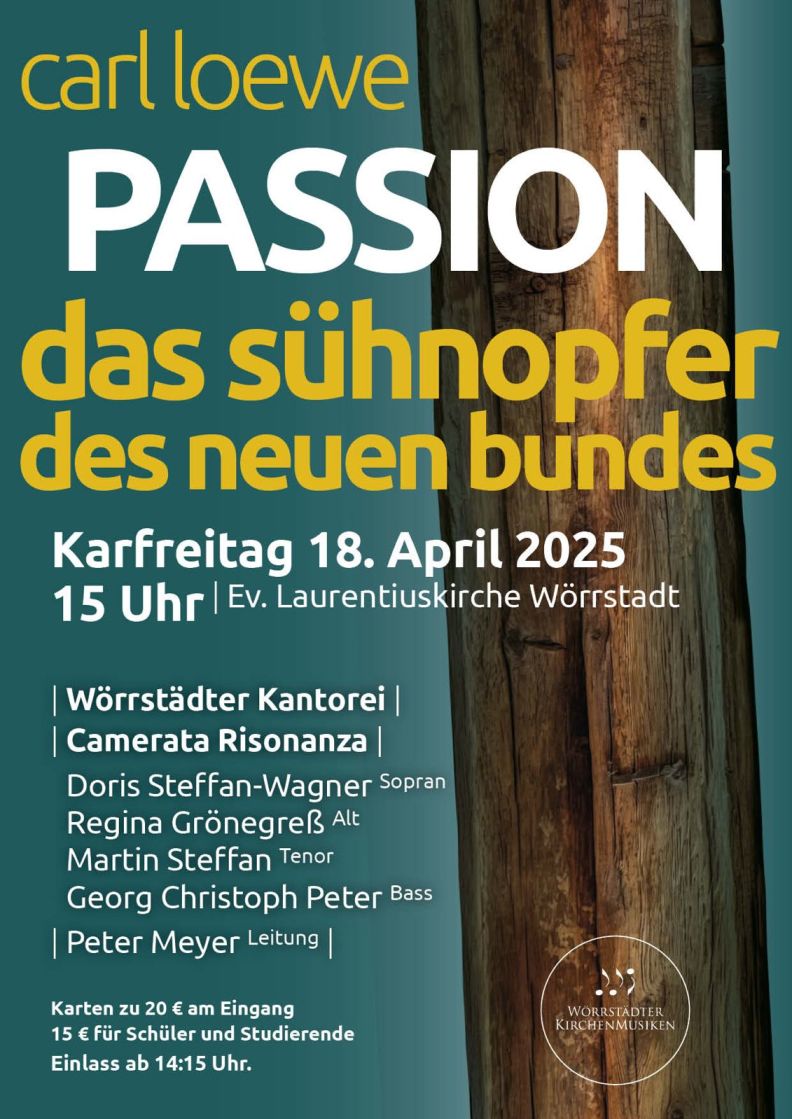 18.4.25, 15 Uhr, Laurentiuskirche Wörrstadt: Carl Loewe, Das Sühnopfer des neuen Bundes. Passionsoratorium in drei Teilen. Doris Steffan-Wagner - Sopran; Regina Grönegreß - Alt; Martin Steffan - Tenor; Georg Christoph Peter - Bass. Wörrstädter Kantorei; Camerata Risonanza. Leitung: Peter Meyer
