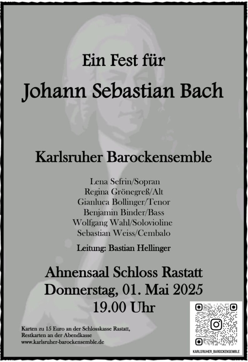 1.5.25, 19 Uhr, Schloss Rastatt (Ahnensaal): "Ein Fest für Johann Sebastian Bach". Arien, Chöre und Orchestermusik. Regina Grönegreß - Alt. Karlsruher Barockensemble. Leitung: Bastian Hellinger