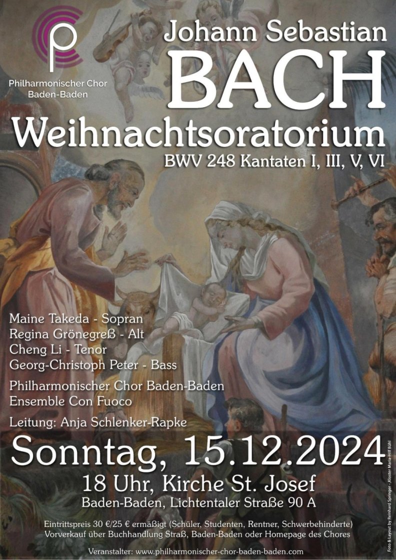 15.12.24, 18 Uhr, St. Josef Baden-Baden: J. S. Bach, Weihnachtsoratorium I, III, V und VI. Maine Takeda - Sopran; Regina Grönegreß - Alt; Cheng Li - Tenor; Georg Christoph Peter - Bass. Philharmonischer Chor Baden-Baden; Con Fuoco Bietigheim. Leitung: Anja Schlenker-Rapke
