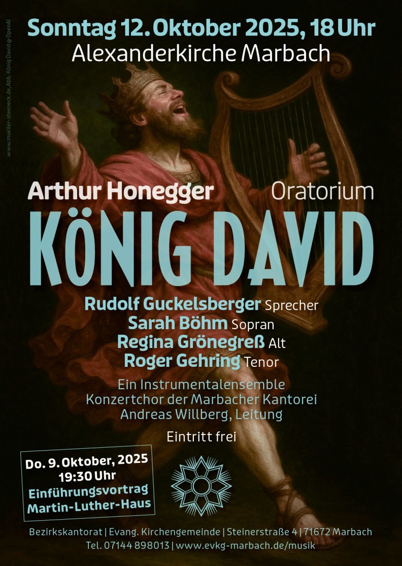 12.10.25, 18 Uhr, Alexanderkirche Marbach am Neckar: A. Honegger, König David. Marie-Pierre Roy - Sopran; Regina Grönegreß - David und Hexe von Endor; Roger Gehring - Tenor; Rudolf Guckelsberger - Sprecher. Instrumentalensemble, Konzertchor der Marbacher Kantorei. Leitung: Andreas Willberg
