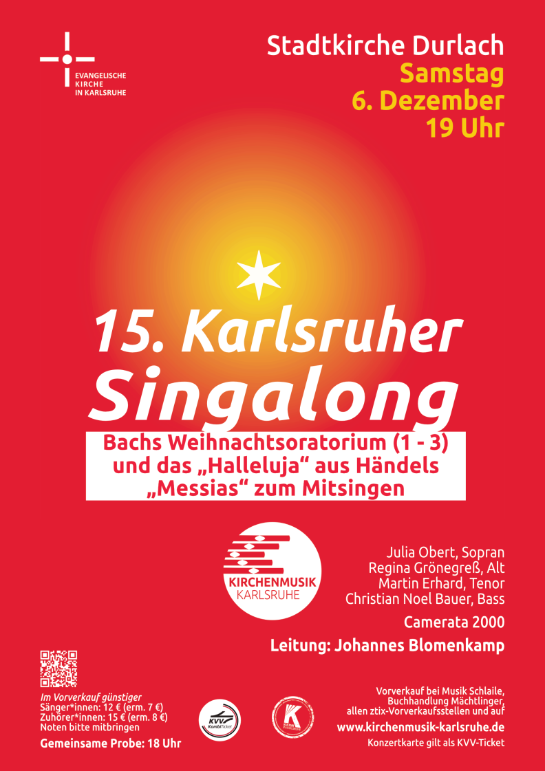 6.12.25, 19 Uhr, Stadtkirche Karlsruhe-Durlach: J. S. Bach, Weihnachtsoratorium I - III Singalong (alle Chöre und Arien dürfen vom Publikum mitgesungen werden). Julia Obert - Sopran; Regina Grönegreß - Alt; Martin Erhard - Tenor; Konstantin Ingenpass - Bass. Camerata 2000. Leitung: Johannes Blomenkamp