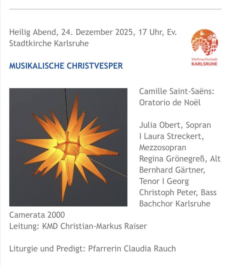 24.12.25, 17 Uhr, Ev. Stadtkirche Karlsruhe: C. Saint-Saëns, Oratorio de Noël. Julia Obert - Sopran; Laura Streckert - Mezzosopran; Regina Grönegreß - Alt; Bernhard Gärtner - Tenor; Georg Christoph Peter - Bass. Bachchor Karlsruhe; Camerata 2000. Leitung: Christian-Markus Raiser